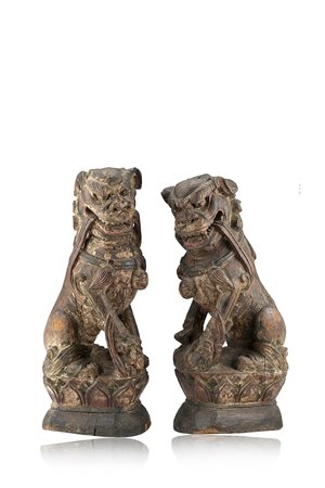 Coppia di sculture in legno raffiguranti leoni buddhisti su basi rettangolari...