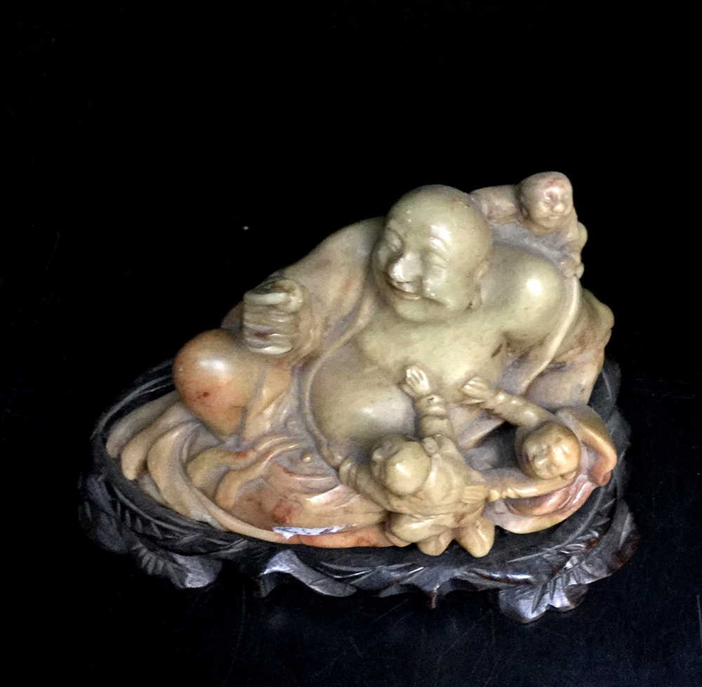 Scultura in pietra saponaria raffigurante Buddha, con base in legno (lievi difetti)