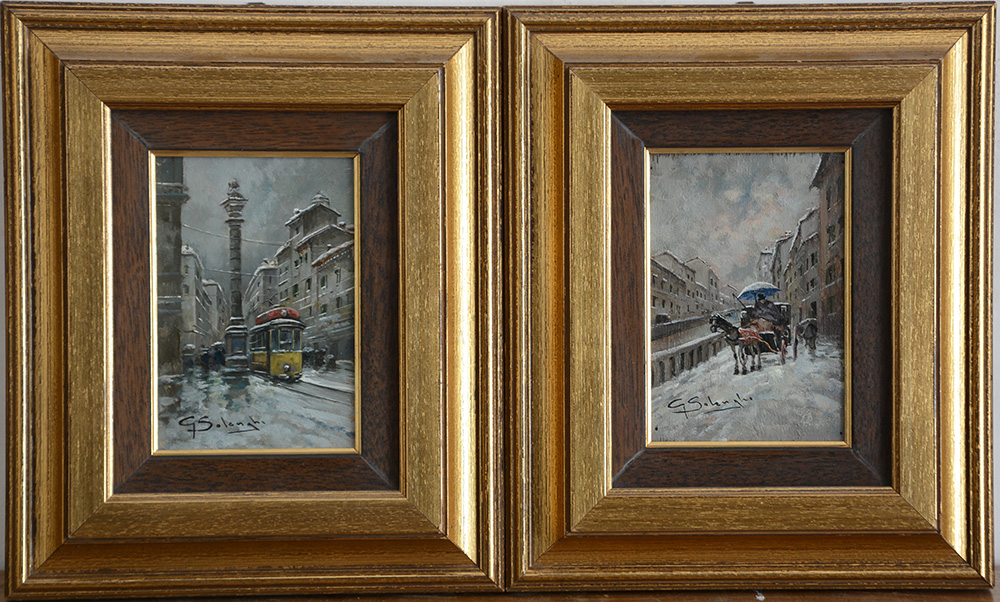 Ignoto "Naviglio sotto la neve, Milano" e "Scorcio di Milano con tram" due dipinti ad olio su tavola (cm 16.5x11) Recano firma G.Solenghi. In cornici