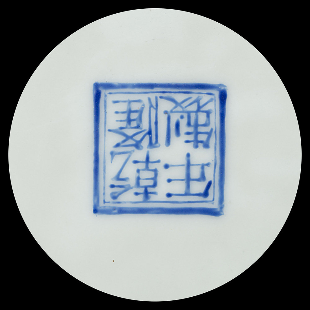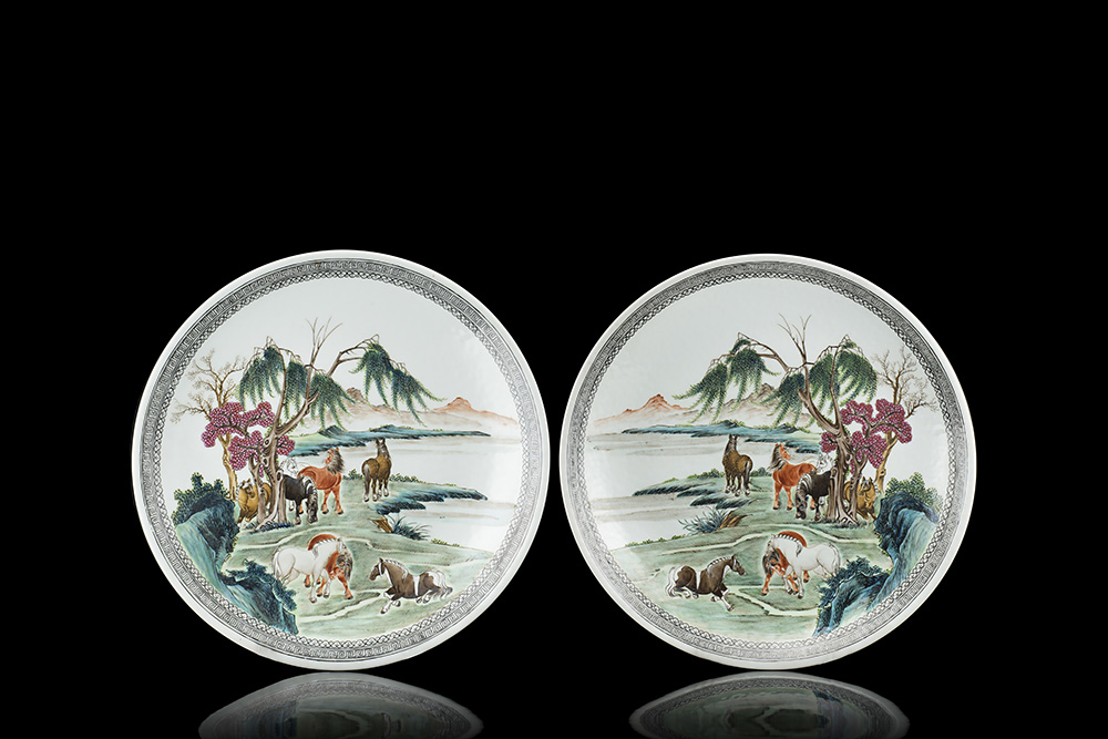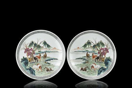 Coppia di piatti in porcellana policroma decorati con il tema degli Otto Cavalli di Wang Mu, con marchio apocrifo Qianlong alla base