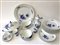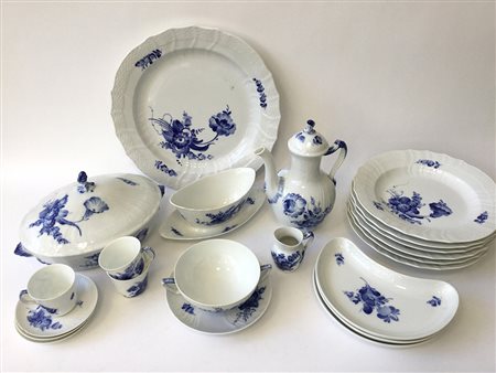 Manifattura di Royal Copenaghen servizio da tavola in porcellana per dodici persone decorato nei toni del blu a fiori composto da 24 piatti piani, 12 fondine, 12 piattini e dodici antipastiere , tazzzine da caffè e da brodo con piattini , caffettiera, 2 zuppiere e 11 tra vassoi salsiere e alzatine (difetti e restauri)