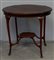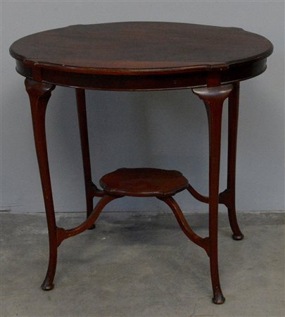 Tavolino da salotto di forma ovale con gambe riunite da traverse e pianetto. (cm 75x69x53) (difetti)
