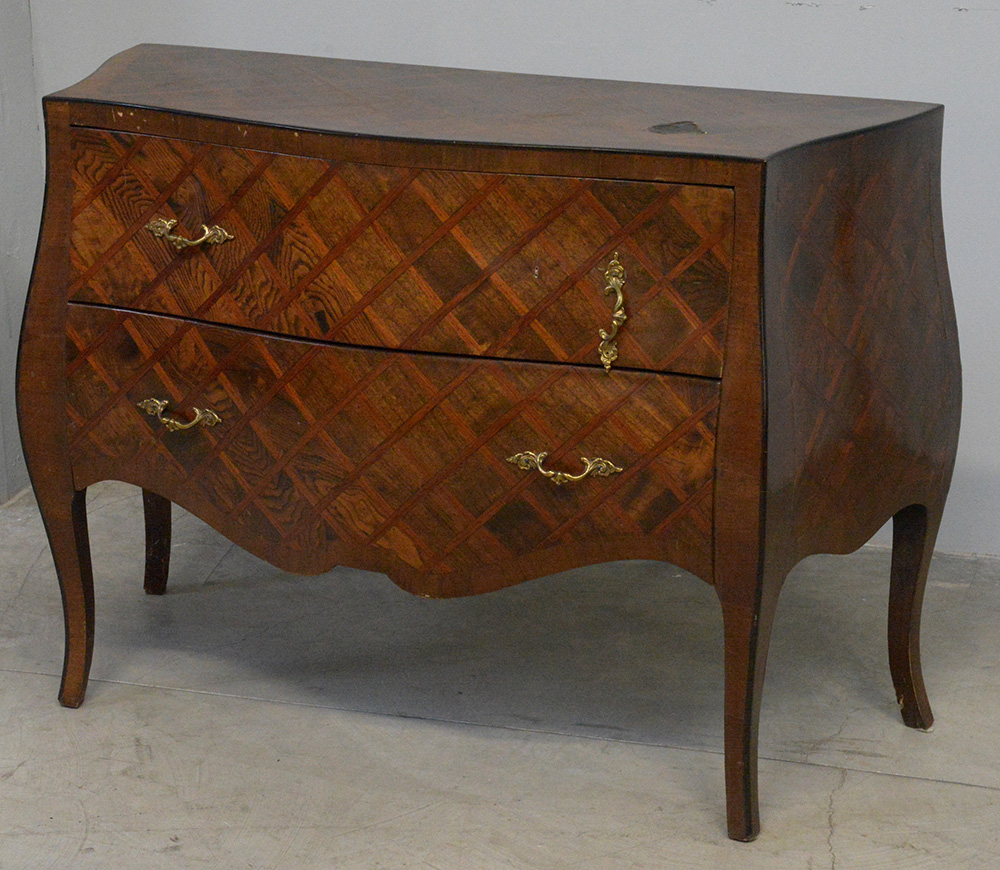 Comò a due cassetti di forma mossa con intarsi romboidali. (cm 110x80x45) (gravi difetti)