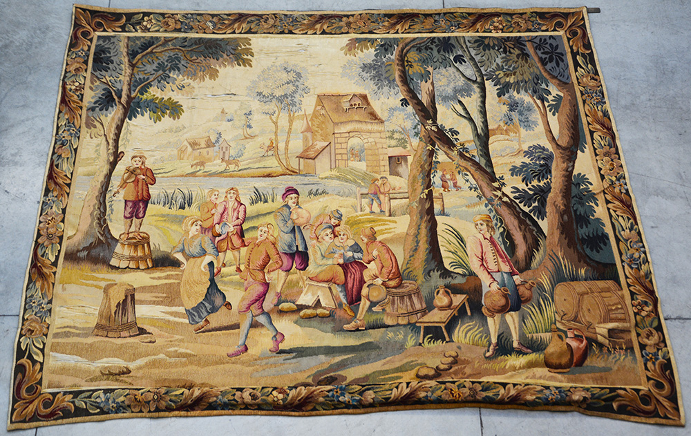 Arazzo francese, secolo XIX. Tessuto a mano in lana, raffigurante scena bucolica in un villaggio sul fiume con personaggi in costume (cm 248x215)(difetti e slabbrature)