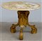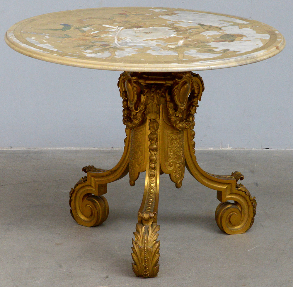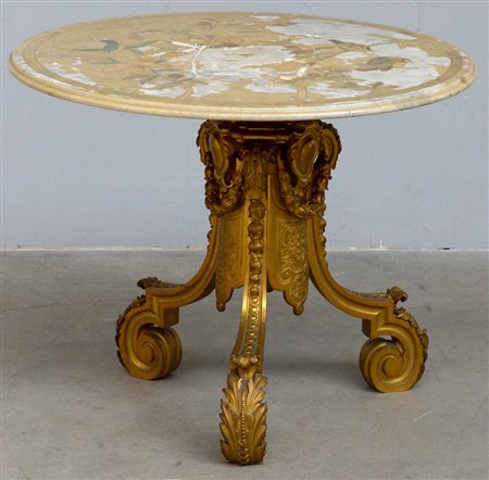 Tavolo da salotto con piano tondo in marmo intarsiato a motivi floreali, volatili e insetti. Base tripode in legno intagliato e dorato a volute e stemma nobiliare (cm 63x77) (difetti e mancanze)