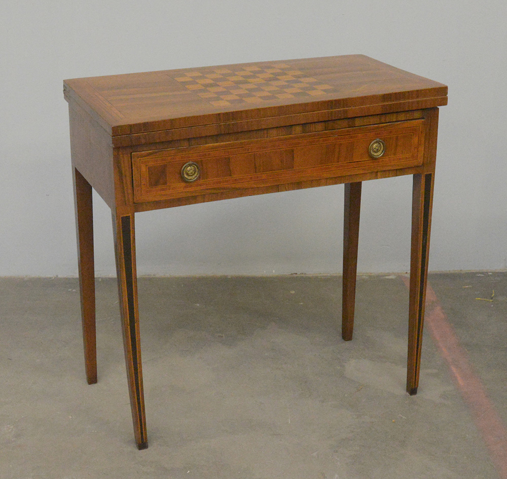 Tavolino da gioco lastronato e filettato in legni vari, piano apribile decorato a scacchiera sul coperchio e con panno di velluto all'interno. Cassetto nella fascia, gambe troncopiramidali. Inizio secolo XIX (aperto cm 77x75x77) (difetti e restauri)