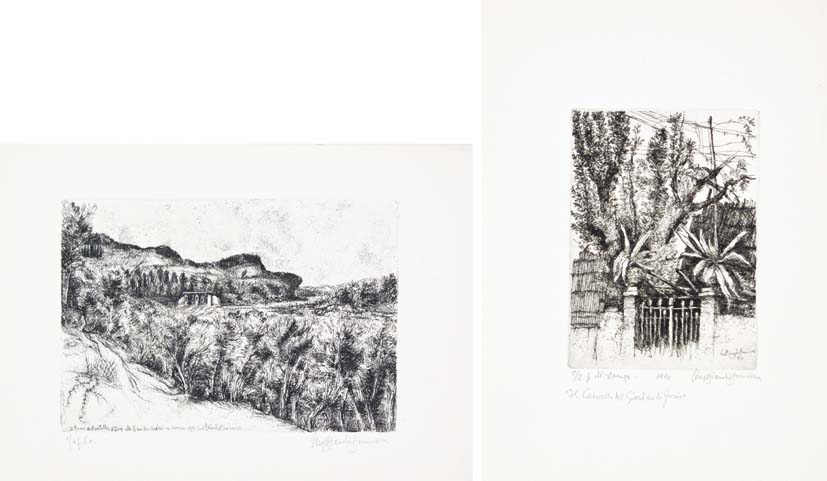 LINO BIANCHI BARRIVIERA Montebelluna 1906 - Roma 1985 Il bosco del Montello - Il cancello del giardino di Zorio lotto di due acqueforti es. 1/10 p.d.A. - es. 2/2 prova di stampa, 23x33,5 25x18,5 (lastre) firma data titolo e tiratura in basso