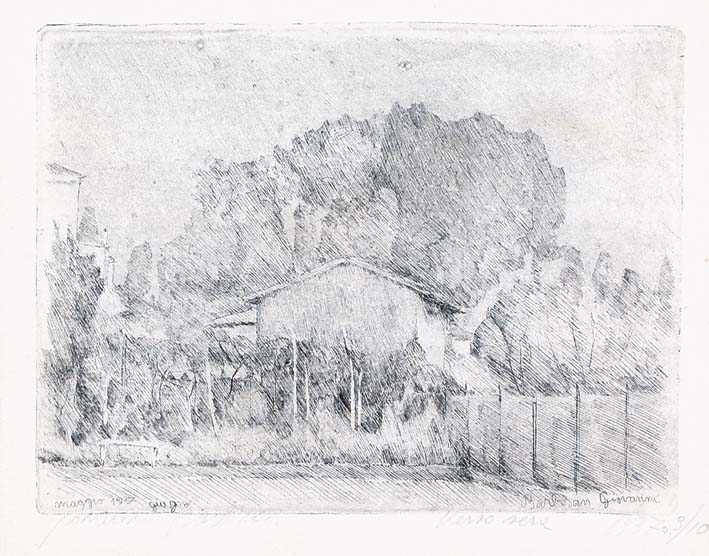 GIOVANNI BARBISAN Treviso 1914 - 1988 Verso sera 1937 acquaforte es. 3/10, 17x23 (lastra) firma data titolo e tiratura in basso Bibliografia "Barbisan" a cura di Marco Goldin ed. Electa pag. 204 tav. 136 esposizioni Galleria d'Arte Pro Padova - etichetta e timbro al retro