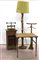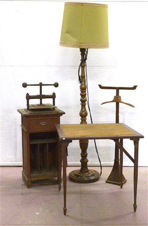 Lotto composto da una vecchia pressa, un tavolino da gioco con gambe pieghevoli, una lampada da terra con paralume in stoffa ed un servomuto (difetti e mancanze)