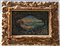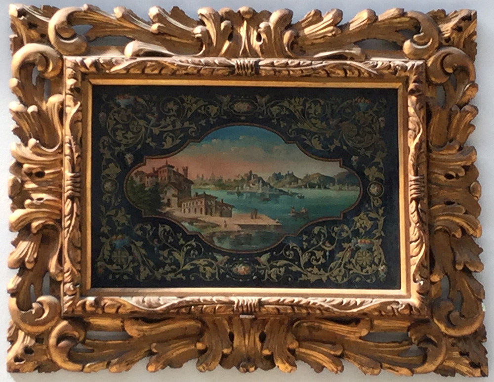 Arte del secolo XIX. Verre-peint raffigurante veduta di Bellaggio e dintorni entro riserva a sagoma contornata da decori dorati a motivi vegetali, fiori, frutti e figure di pappagalli in policromia. In cornice intagliata e dorata (cm 40x60) (difetti)