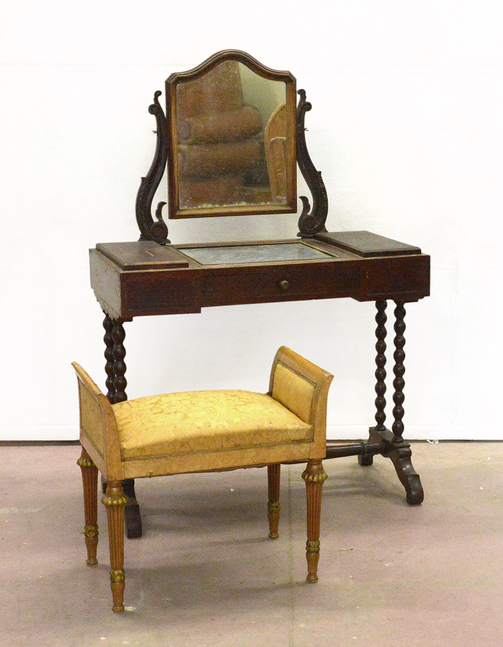 Lotto composto da una toelette con specchio basculante, pianetto in marmo e gambe tornite unita ad uno sgabello con fascia lastronata (difetti e mancanze)