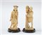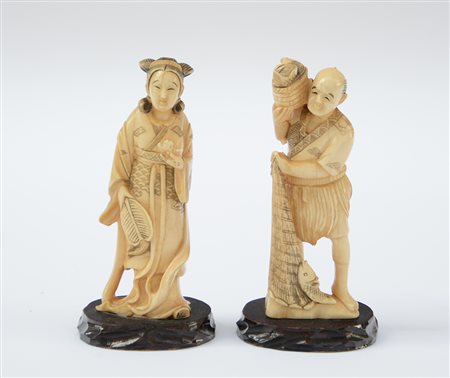 Due sculture in avorio raffiguranti Dama e pescatore, base in legno (h cm 14)