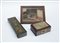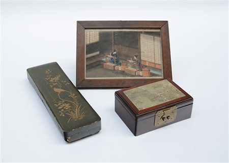 Lotto composto da una scatola portagioie in legno e pietra dura, una scatola in legno laccato ed un piccolo dipinto inchiostro e colore su tessuto (difetti)