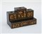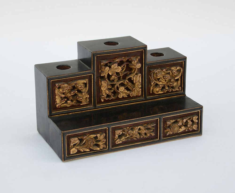 Piccolo mobiletto da esportazione in legno laccato con tre cassettini. Decorato con fregi intagliati, traforati e dorati (cm 25x15x13) (difetti e mancanze)