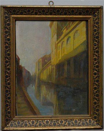 Ignoto "Scorcio del Naviglio a Milano" olio su compensato (cm 39x30) siglato in basso destra, in cornice (difetti)