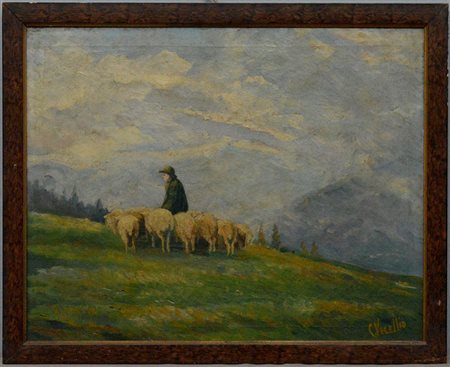 Vecellio "Paesaggio montano con pastore e gregge" olio su tela (cm 40x51) firmato in basso a destra, in cornice (lievi difetti)