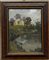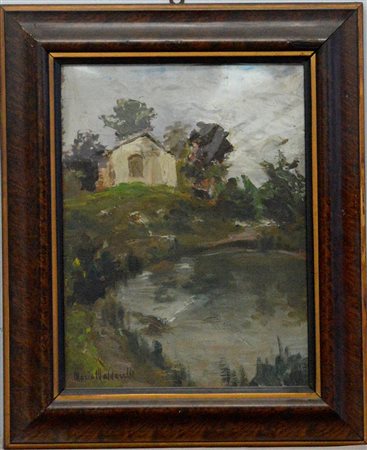 “Paesaggio con casolare e corso d’acqua” olio su compensato (cm 40x30) firmato in basso a sinistra, in cornice (Difetti)