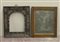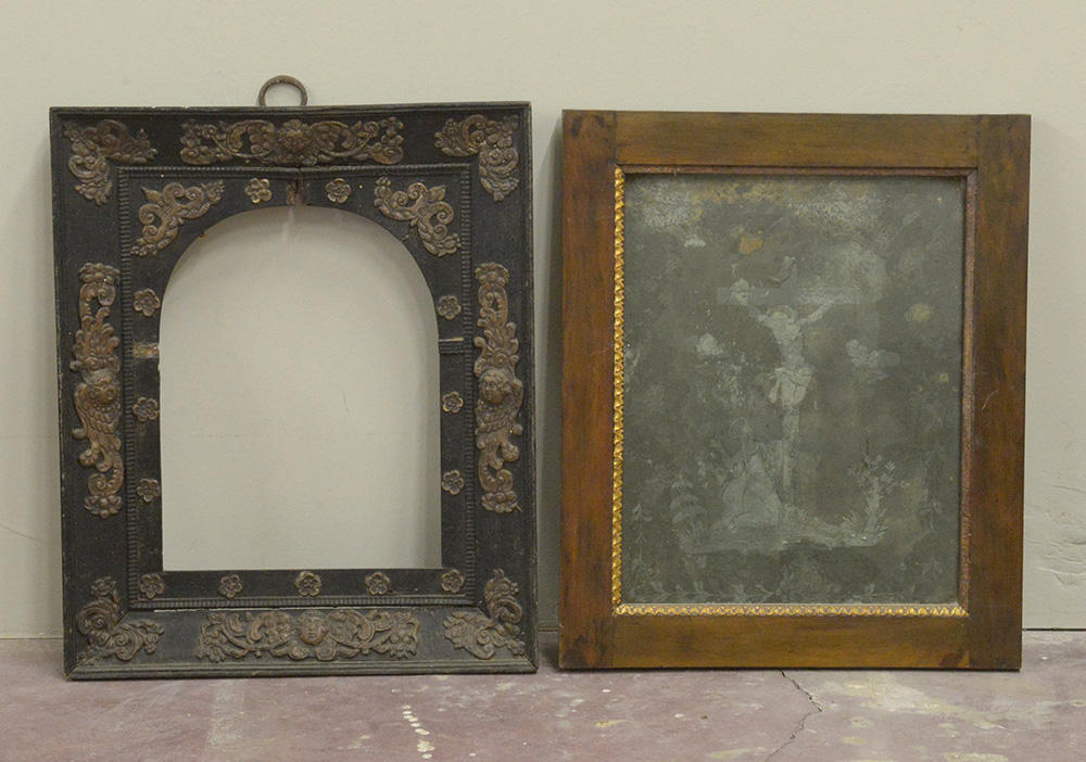 Lotto composto da una specchierina del secolo XIX con specchio inciso con figura di Cristo ed una cornice in legno ebanizzato decorata da fregi in metallo (difetti e mancanze)