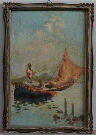 Ignoto "Pescatori in laguna" olio su compensato (cm 30x20) in cornice