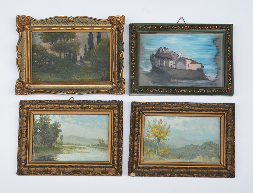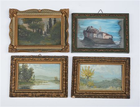 Lotto di quattro piccoli dipinti raffiguranti paesaggi, autori e misure...