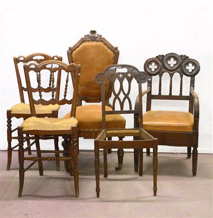 Lotto composto da una poltrona e quattro sedie diverse del secolo XIX (difetti e mancanze)