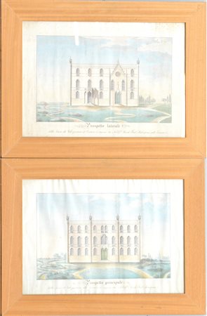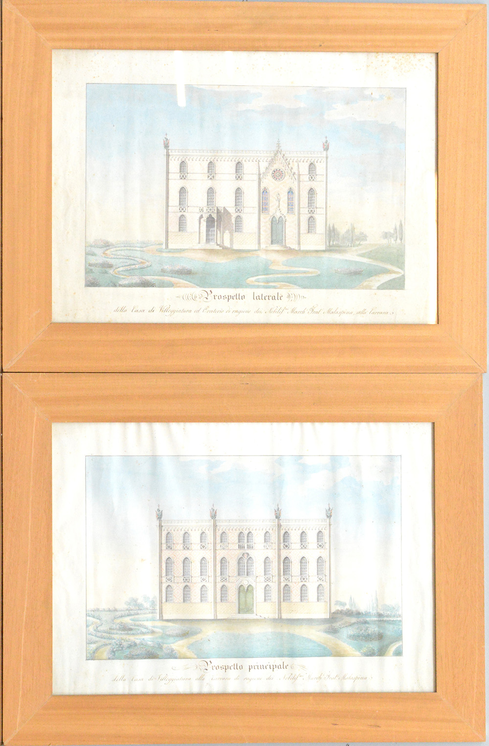 Coppia di incisioni acquarellate raffiguranti prospetti della casa di villeggiatura dei Marchesi Malaspina, in cornici (cm 38x54) (difetti)