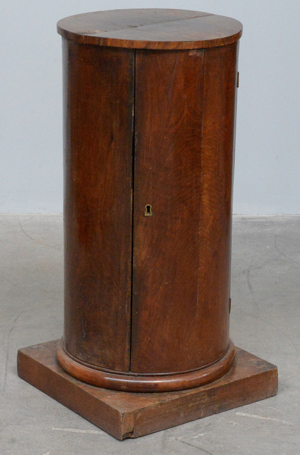 Comodino a colonna ad un'anta lastronato in noce e radica di noce. Base quadrata, secolo XIX (cm 40x78x40) (difetti e mancanze)
