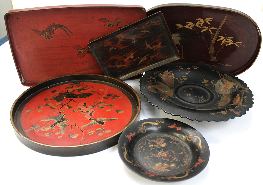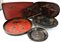 Lotto composto da sei vassoi laccati in rosso, nero, oro di manifattura cinese e giapponese (difetti)