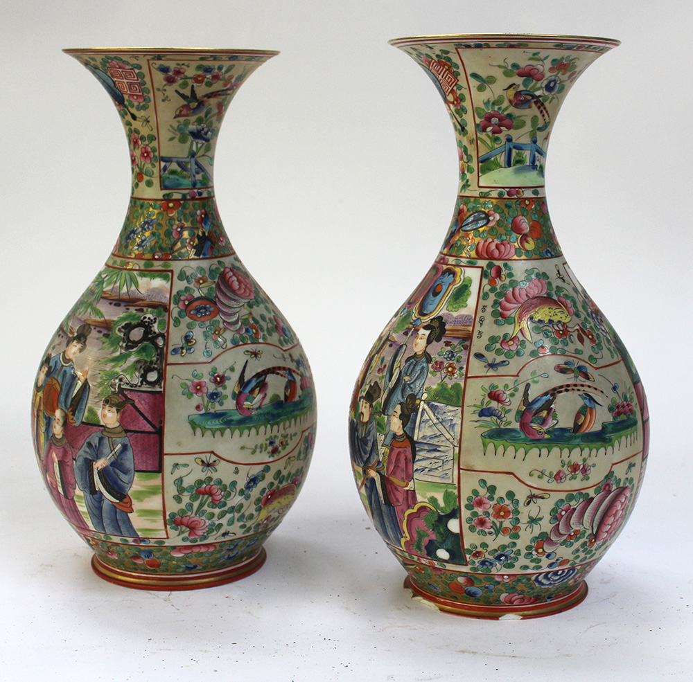 Coppia di vasi in porcellana policroma decorati con figure e motivi floreali