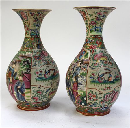Coppia di vasi in porcellana policroma decorati con figure e motivi...