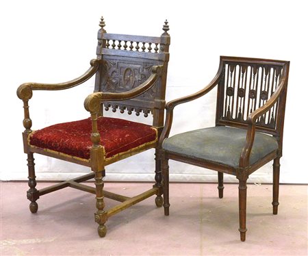 Lotto di due poltrone in stile in legno intagliato (difetti e mancanze)