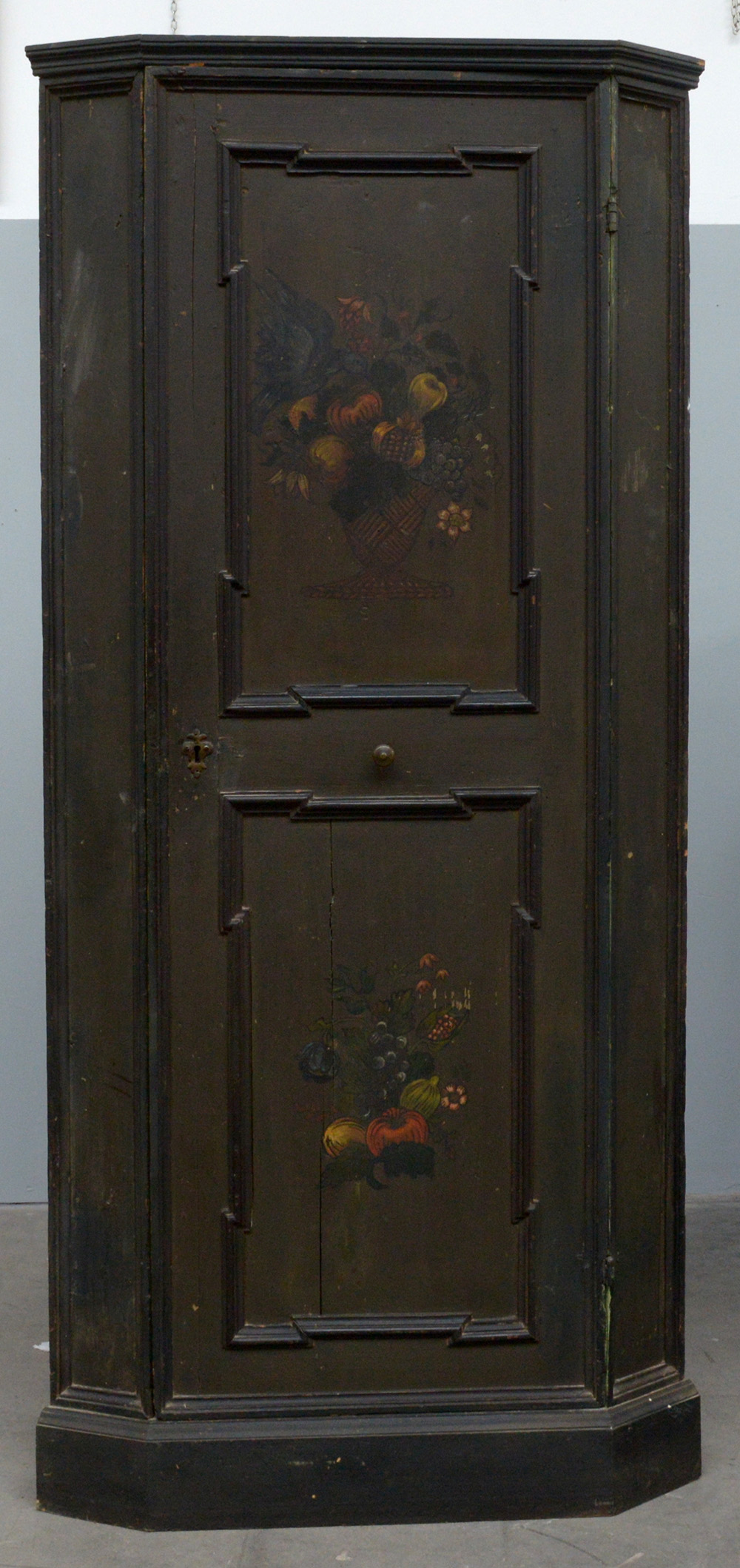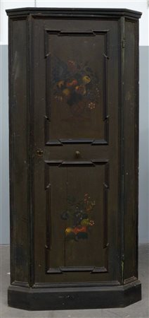 Cantonale in legno laccato a fondo verde scuro ad un'anta riquadrata e dipinti in policromia con cesti di frutta, secolo XVIII (cm 100x205x68) (difetti e lacca di epoca posteriore)