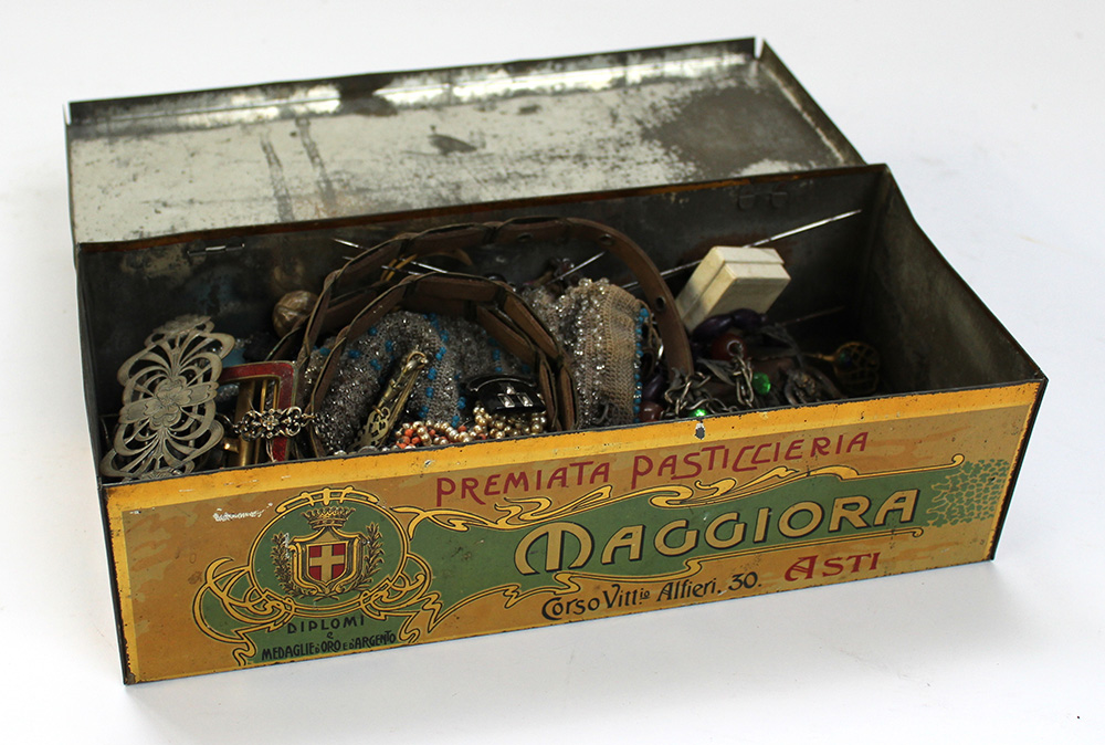 Scatola in latta contenente bigiotteria varia (difetti e mancanze)