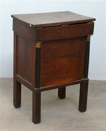 Comoda in noce decorata con mezze colonnine laterali ebanizzate, piano apribile e gambe squadrate. Secolo XIX (cm 56x73x37) (difetti)