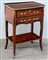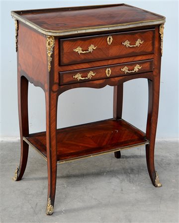 Comodino lastronato in legni vari a due cassetti sul fronte e gambe mosse riunite da pianetto. Guarnizioni e fregi in bronzo dorato (cm 54x76x36)