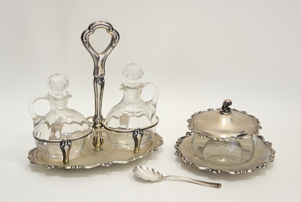 Lotto composto da un servizio da tavola ed una formaggera in argento e vetro (lievi difetti)