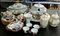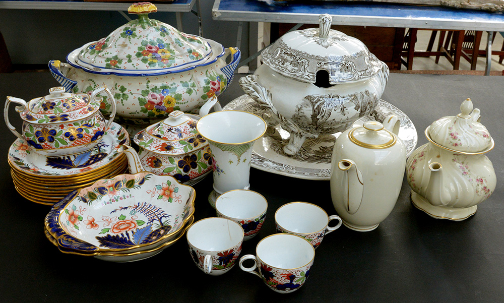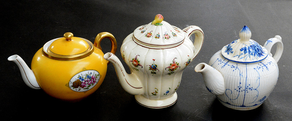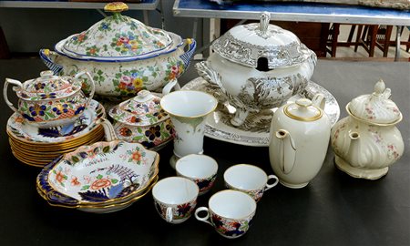 Mnifatture diverse, lotto composto da due zuppiere con coperchio, un grande piattoi, sei teiere, una zuccheriera, un vasetto, dieci piattini due ciotoline e quattro tazzine in ceramica e porcellana di diversa epoca e decoro (difetti e mancanze)