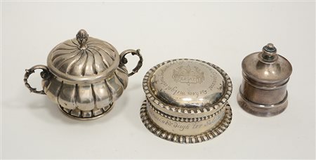 Lotto composto da una zuccheriera e due scatole in argento di forme diverse (gr 350 ca) (lievi difetti)