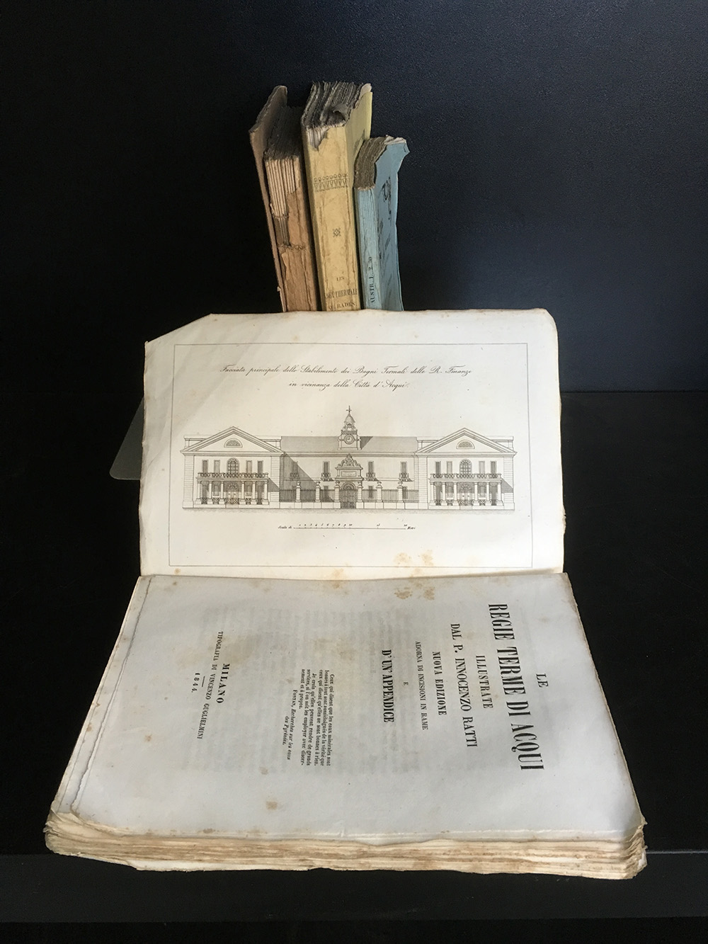 [ACQUE TERMALI] Lotto di 5 volumi relativi alle fonti termali e alle acque minerali: SCOZIA, Francesco Maria. Sulla pirenta murisenghina. Torino, Mairesse, 1794; RATTI, Innocenzo. Le regie terme di Acqui. Milano, Guglielmini, 1844; FEDELI, Fedele. Cenno sulle proprietà medicinali...delle terme di Montecatini. Pisa: Nistri, 1865. CAPSONI, Giovanni. Guida alle principali acque minerali della Lombardia e del Veneto. Milano, Colombo, 1852. MINNICH, J. Alois. Les Eaux Thermales de Baden en Suisse. Zurigo: Meyer, Zeller, 1846. Brossure editoriali coeve, qualche difetto, alcuni volumi con antiporta incisa. Non collazionato e difetti da esaminare.