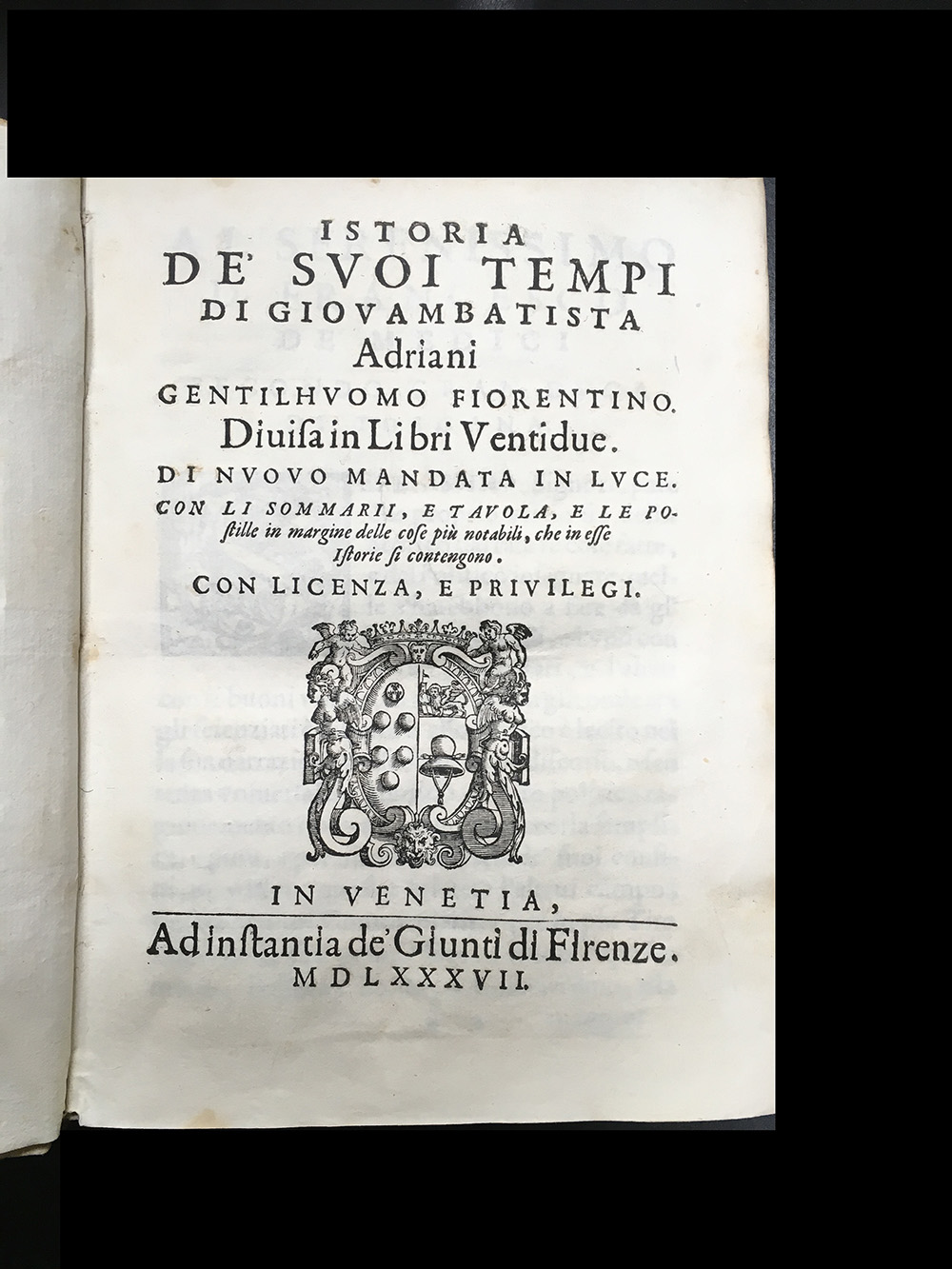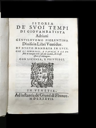 ADRIANI G. B. Istoria de' suoi tempi di Giouambatista Adriani gentilhuomo fiorentino. Firenze: Giunti, 1587. (15 di 22 libri) 4to, stemma araldico al frontespizio. Legatura coeva in piena pergamena con titiolo manoscritto al dorso. Buona copia. Non collazionato e difetti da esaminare.