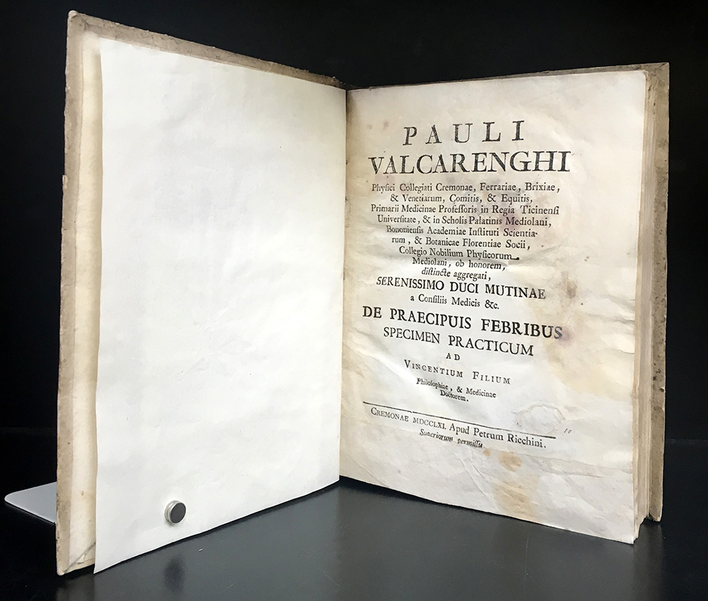 VALCARENGHI Paolo. De praecipuis febribus specimen practicum. Cremona: Pietro Ricchini, 1761. 4to.; cartona tura alla rustica originale. Prima edizione importante. Non collazionato e difetti da esaminare.