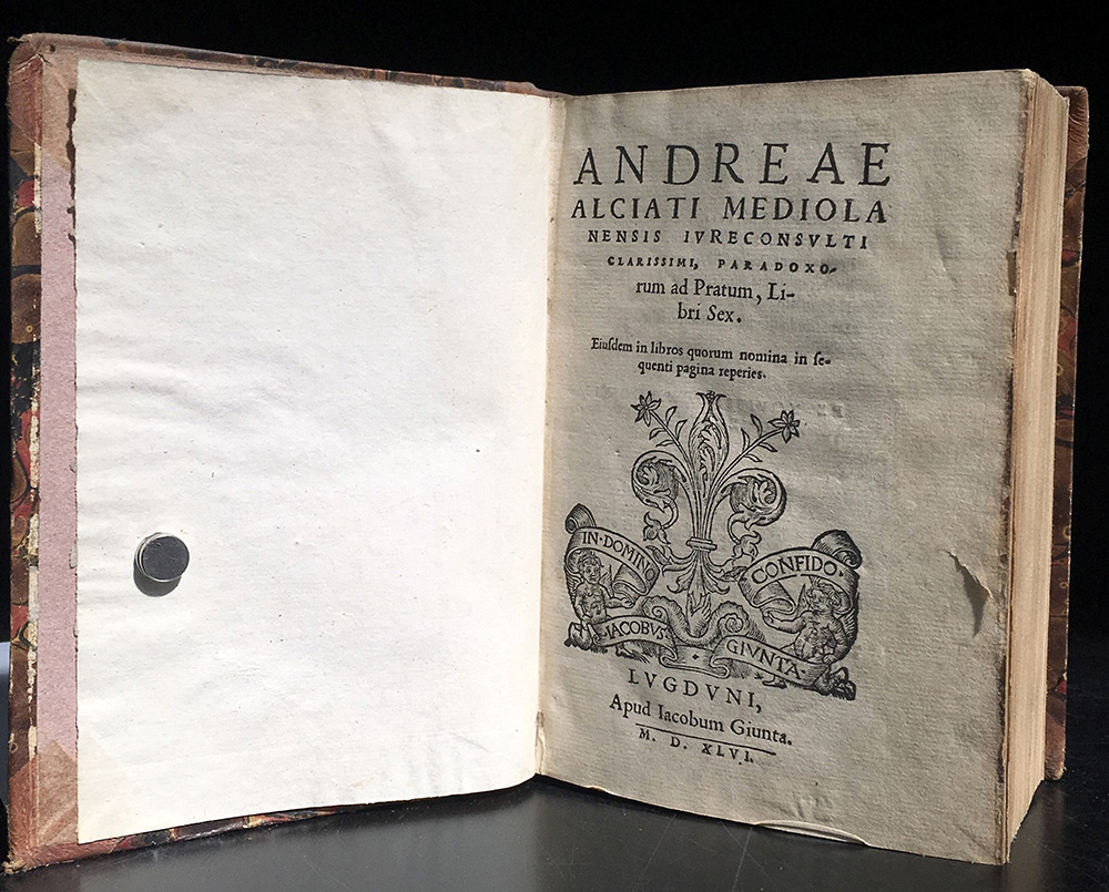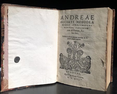 ALCIATI, A. Mediolanensis Iurisconsulti ... paradoxum ad Pratum. Lione: Jacopo Giunta, 1546. 8vo, legatura posteriore in mezza pelle, grande xilografia al frontespizio, iniziali xilografiche. Non collazionato e difetti da esaminare.