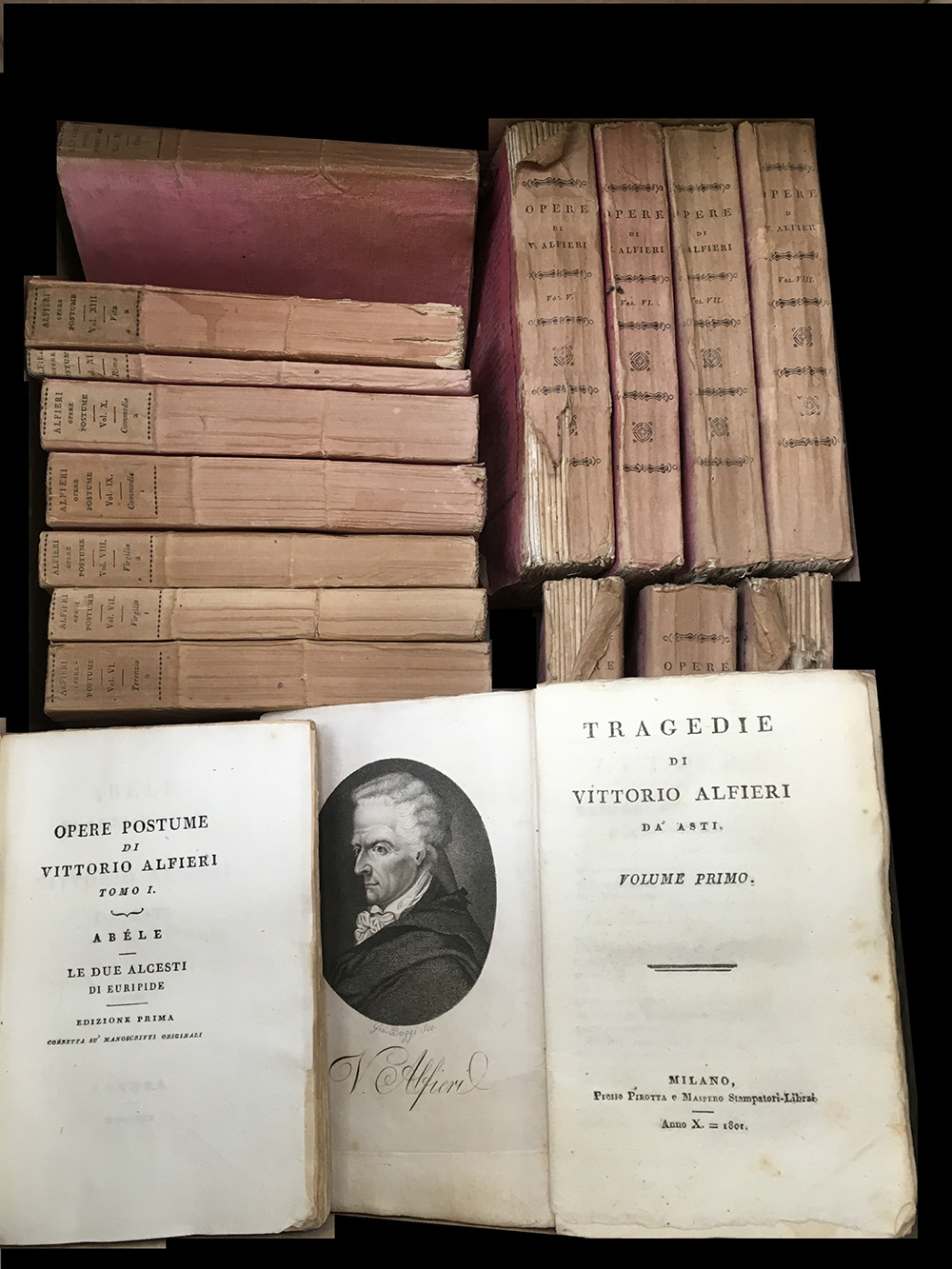 ALFIERI V. Opere di Vittorio Alfieri. Milano: Pirotta, Maspero, 1801-2. 8vo, 8 voll, ritratto in antiporta al primo volume, brossura coeva ; Opere Postume. Londra, 1804 (ma Firenze: Piatti) 12mo, 12 vol. Ritratto in antiporta, brossura coeva. 20 volumi in totale che raccolgono tutti gli scritti alfieriani di cui molti in prima edizione. Non collazionato e difetti da esaminare.