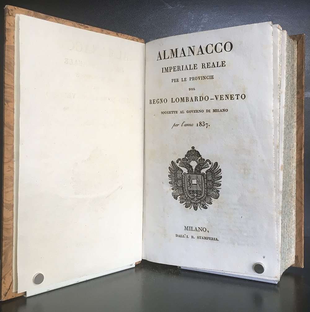ALMANACCO Imperiale reale per le provincie del Regno lombardo-veneto. Milano: Reale Stamperia, 1837. 8vo, legatura posteriore in cartonato. Non collazionato e difetti da esaminare.