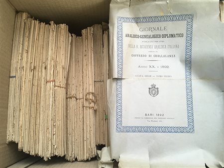 [ARALDICA] - ANGIUS, Vittorio. Sulle famiglie nobili della monarchia di Savoia. 44 dispense. Torino: Fontana e Isnardi, 1841-44. [INSIEME A]: CROLLALANZA, G.B. Giornale Araldico-Genealogico-Diplomatico. Pisa: diverse annate [E:] CROLLALANZA, G.B. Dizionario Storico-Blasonico delle Famiglie Nobili e Notabili Italiane Estinte e Fiorenti. Non collazionato e difetti da esaminare.