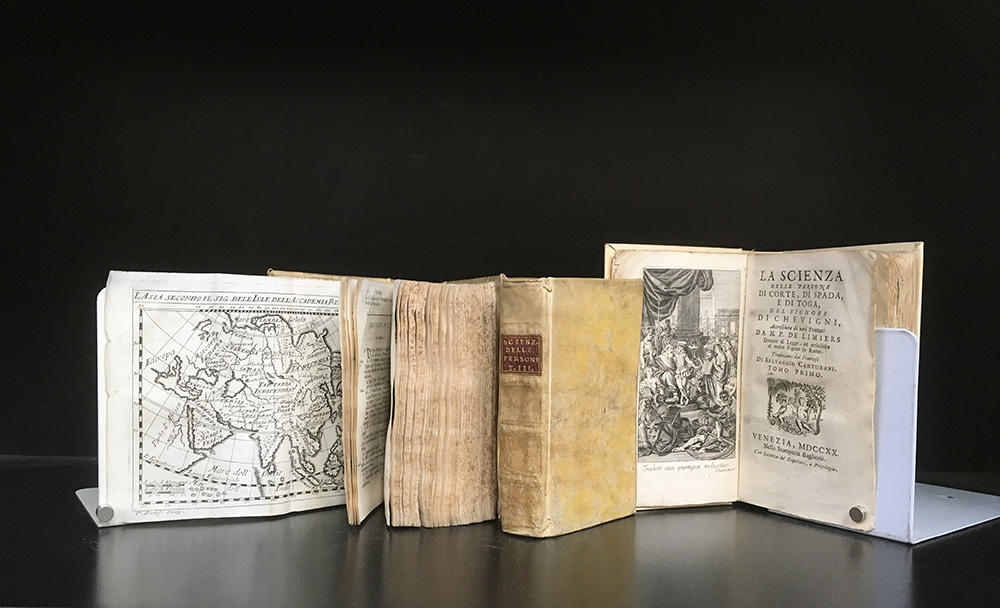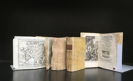 [ARALDICA] La scienza delle persone, di corte, di spada, e di toga di de Chevigny, stampati nel 1720 a Venezia da Baglioni. 3 (dei 4 volumi), 8vo, 2 in legatura uniforme in pergamena coeva e uno in pergamena moderna. Numerose carte ripiegate incise in rame con alberi genealogici e mappe. Non collazionato e difetti da esaminare.