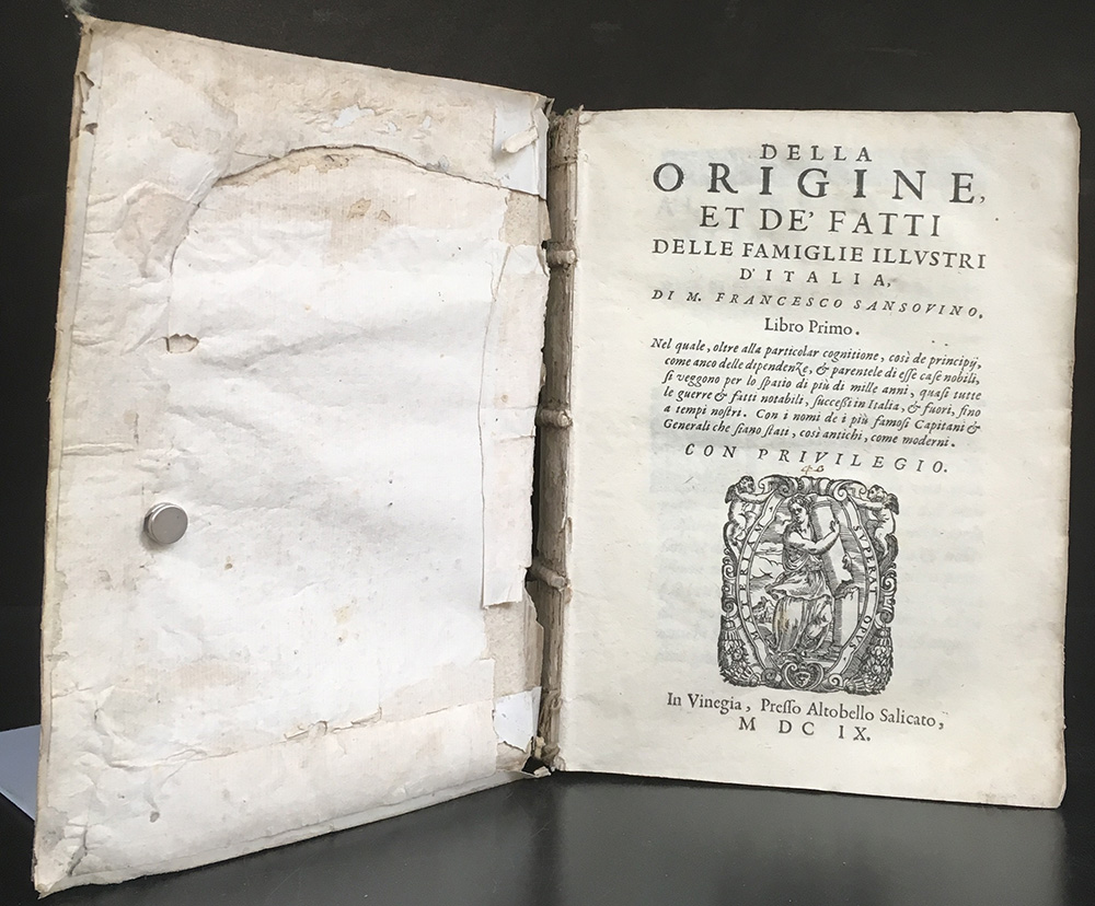 [ARALDICA] SANSOVINO F. Della origine, et de' fatti delle famiglie illustri d'Italia. Venezia: Altobello Salicato, 1609. 4to, con alcuni stemmi aggiunti e colorati a mano, incisione in legno al frontespizio. Pergamena coeva, titolo manoscritto al dorso (rovinata). Non collazionato e difetti da esaminare.