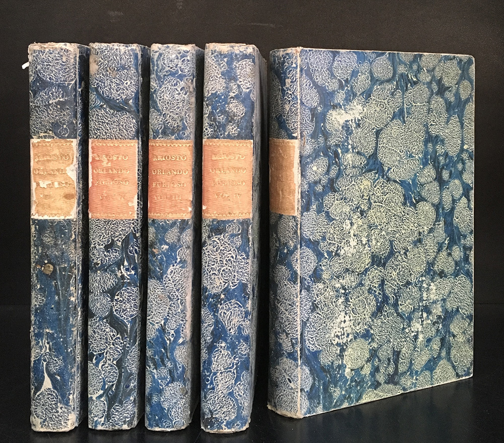ARIOSTO. Orlando Furioso. Milano: Bettoni, 1825. 8vo, 5 voll. Legatura coeva in cartonato marmorizzato con titolo in oro su tassello al dorso. Non collazionato e difetti da esaminare.