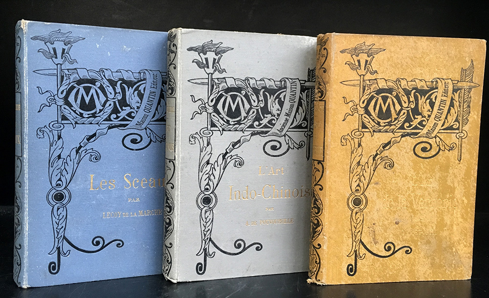 [ARTE] Bibliotheque de l'enseignmenet des beaux-art. Parigi: Quantin, 1885-94. 8vo, 3 volumi (L'Art indo-chinois , de la verriere, les sceaux) numerose illustrazioni nel testo, legature editoriali stampate in nero e oro. Non collazionato e difetti da esaminare.