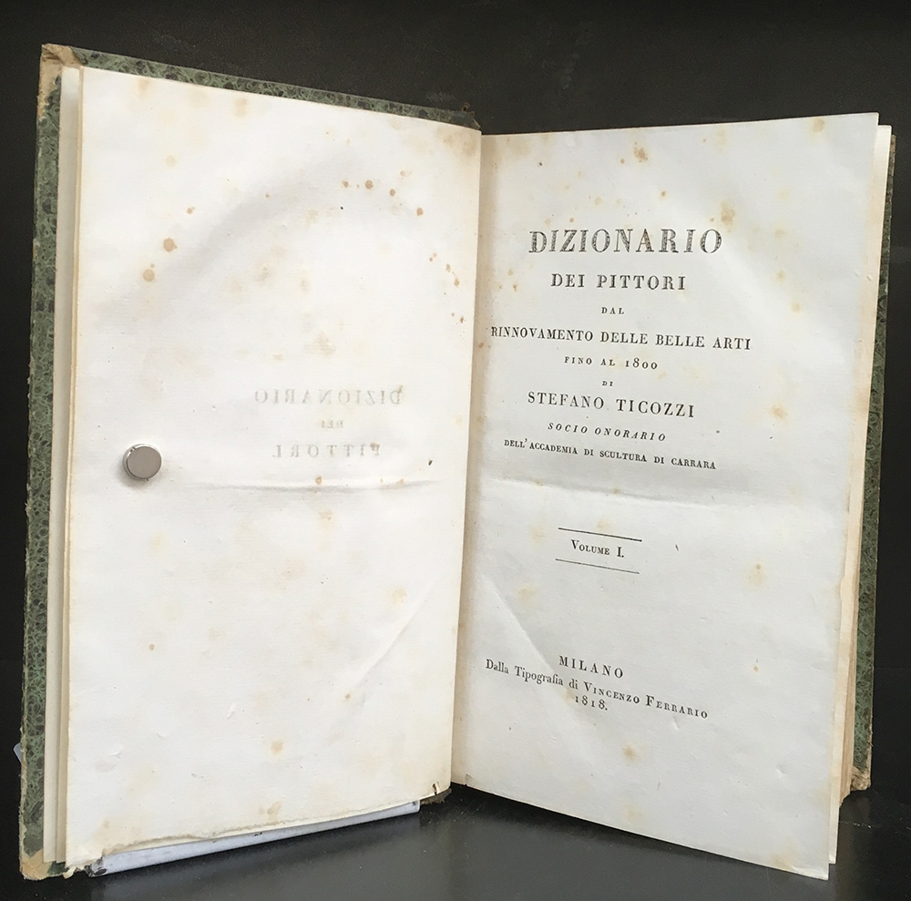 [ARTE] TICOZZI, S. Dizionario dei pittori dal rinnovamento delle belle arti fino al 1800. Milano: Ferrario,1818. 8vo 2 voll in uno. 2 tavole, legatura coeva con dorso in marocchino verde titolo in oro. Non collazionato e difetti da esaminare.
